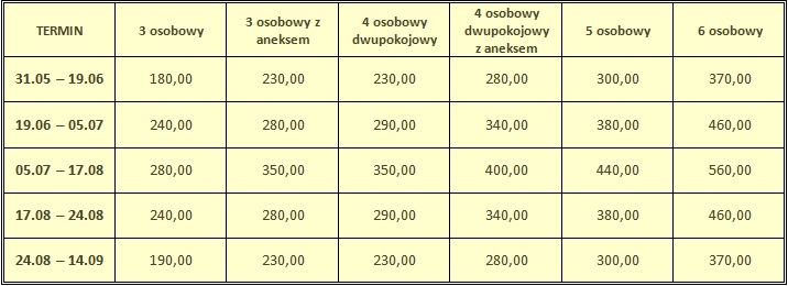 *Podane ceny są cenami za domek za dobę przy wskazanej ilości osób wynikającej z nazwy domku. Dodatkowa osoba w domku 50 zł doba.